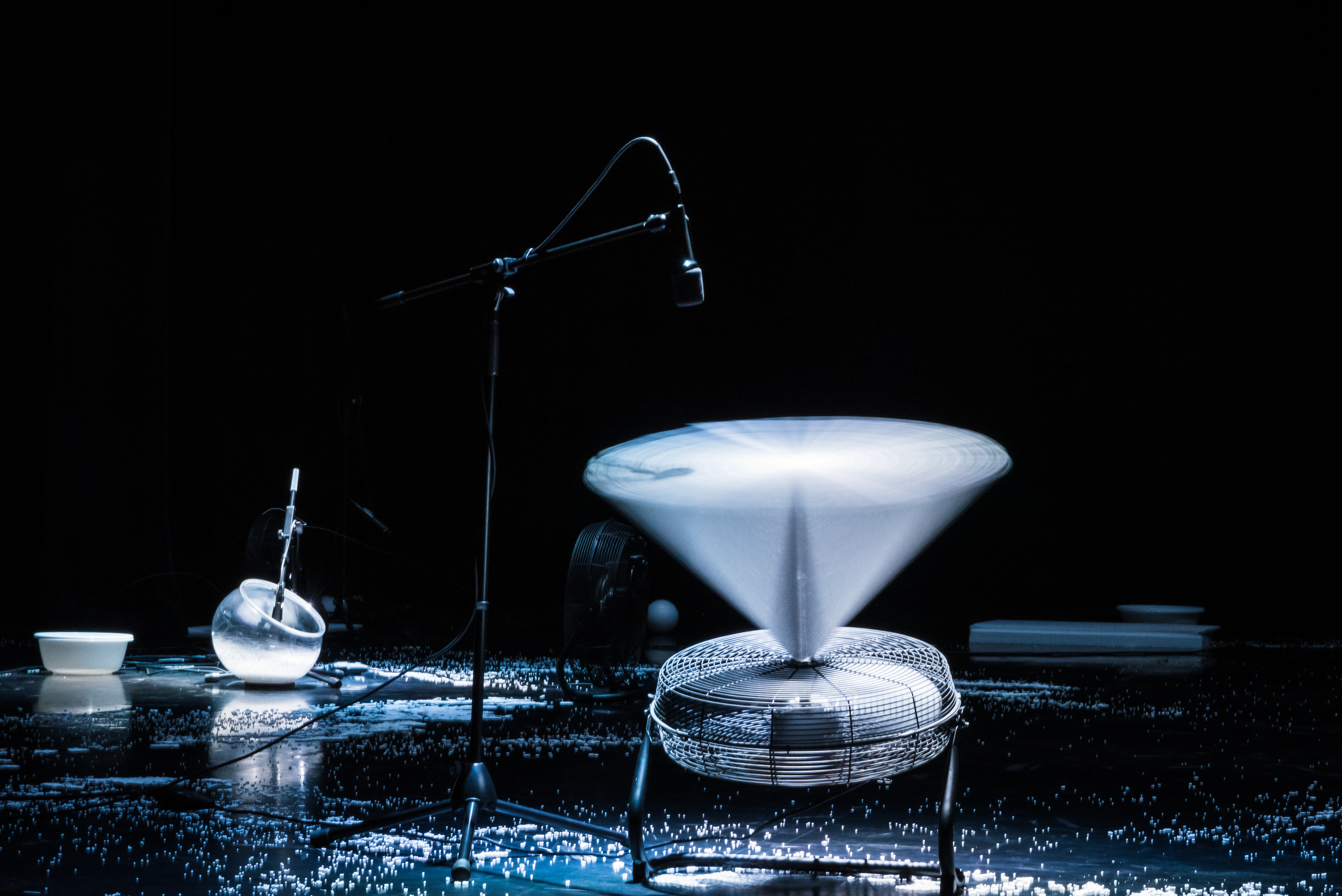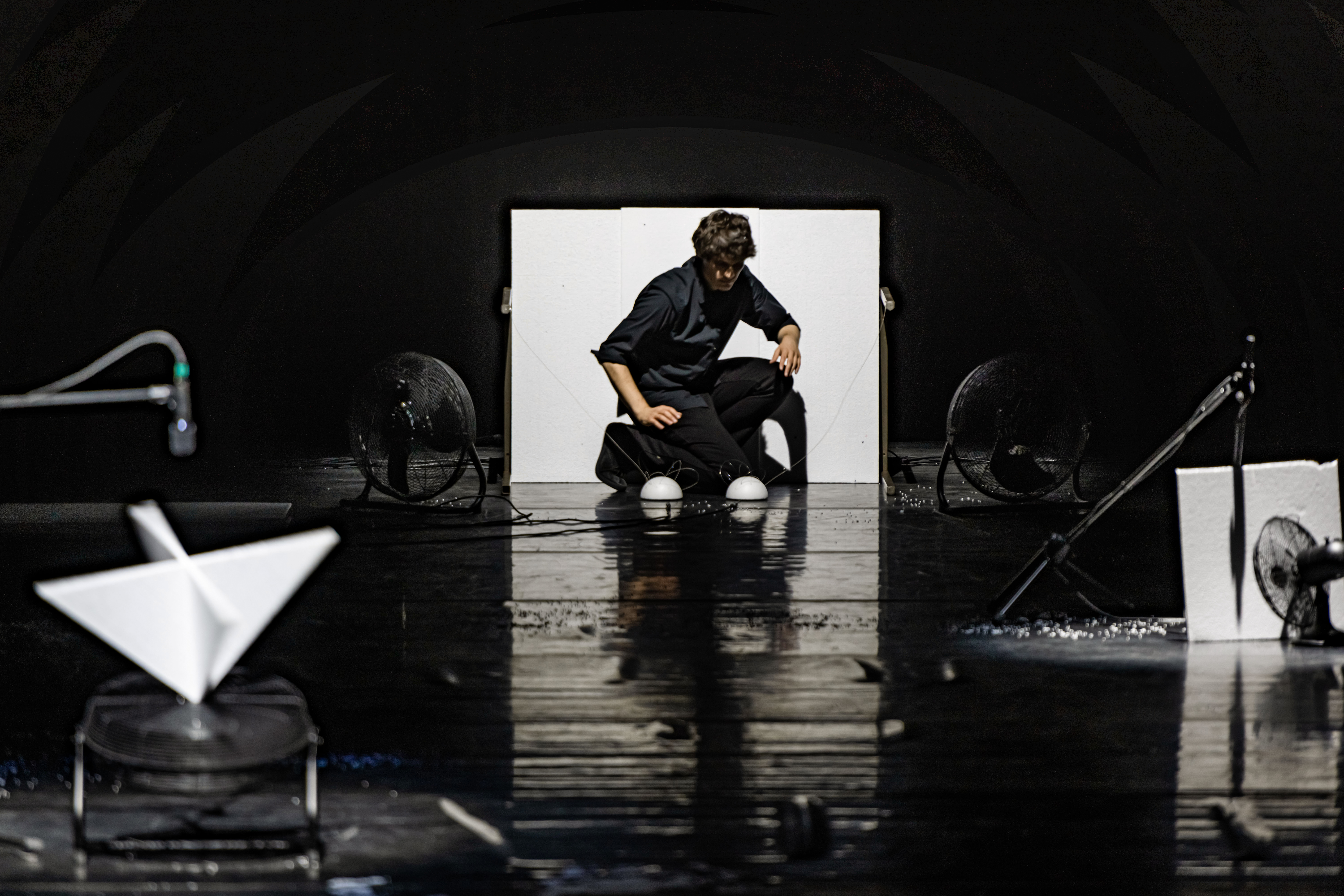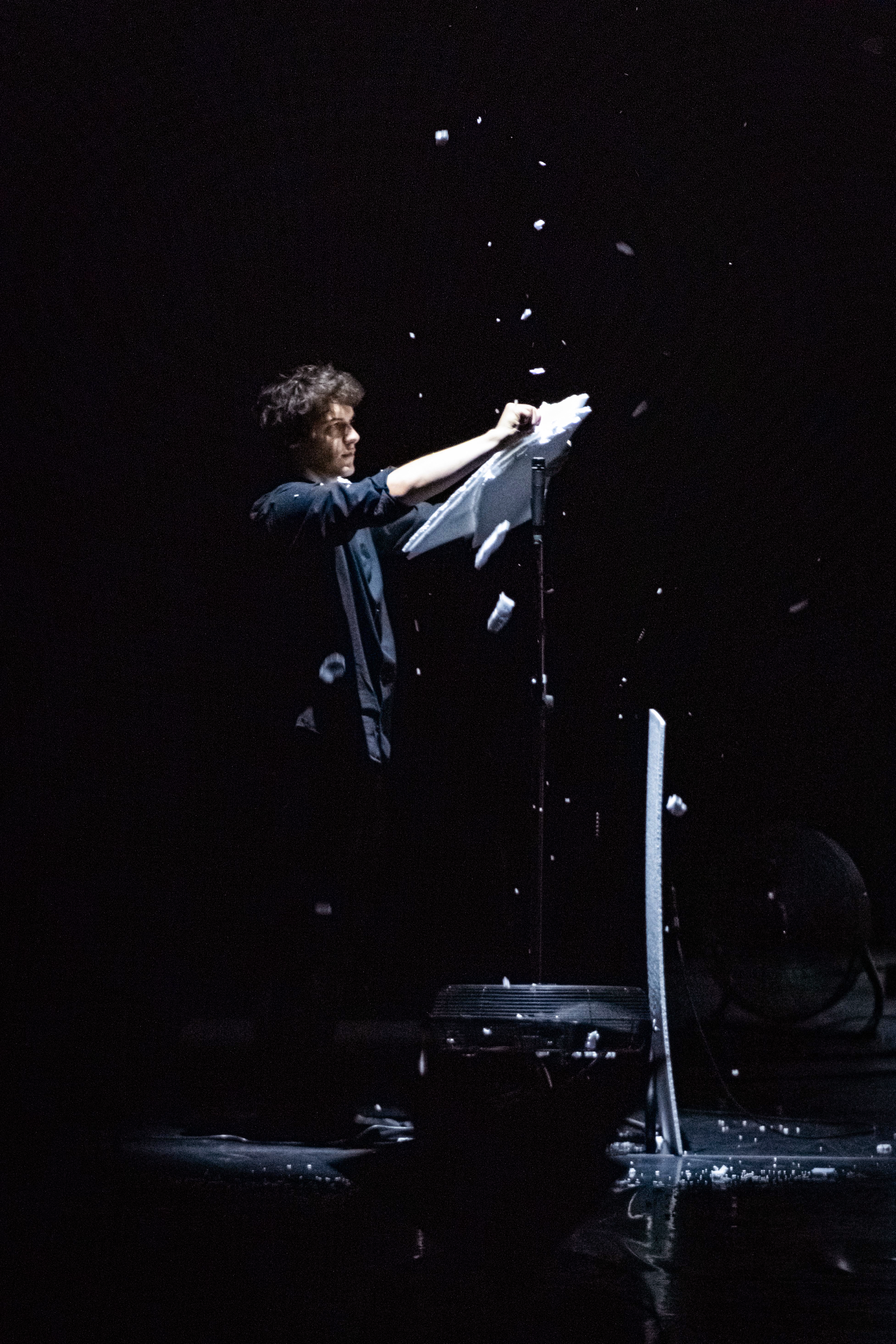 Le premier rôle de cette performance est tenu par des formes en polystyrène. Du Sagex, si vous préférez. Des formes manipulées par un opérateur, cassées, broyées, en une sorte de ballet étrange où l’esprit de jeu et de découverte s’empare d’un matériau pour l’offrir en support à notre imaginaire.
