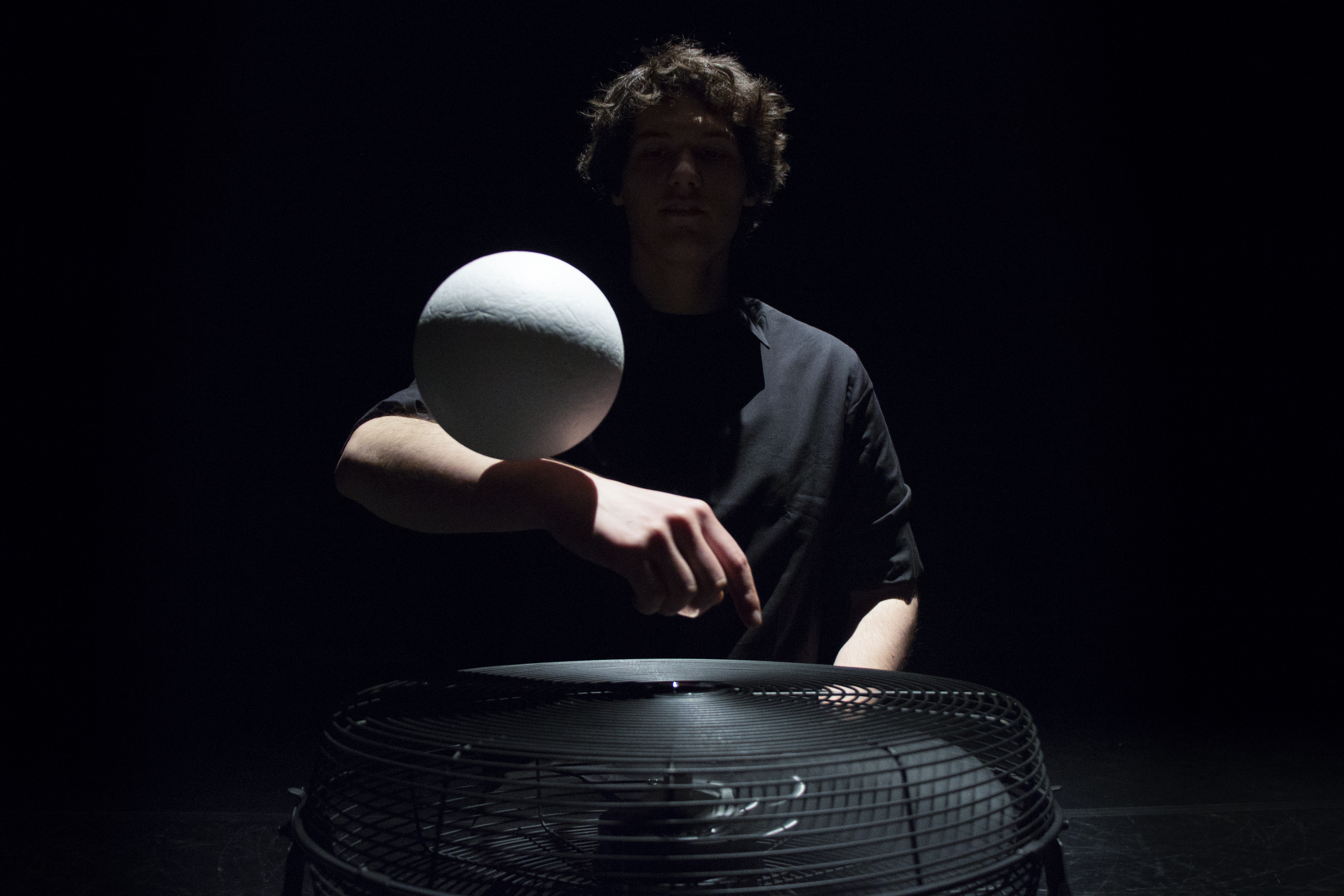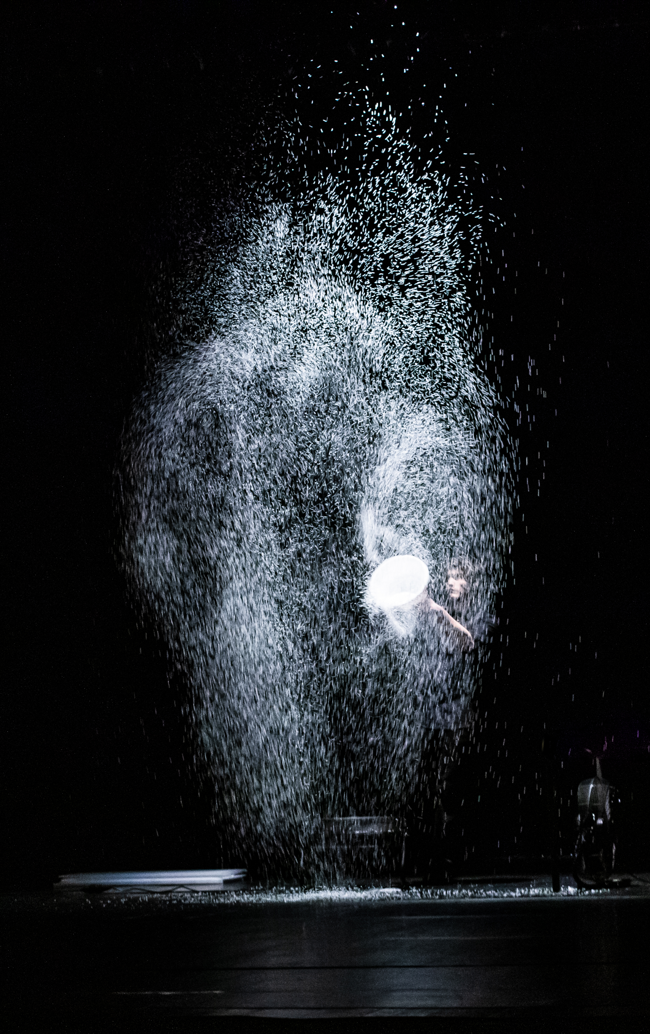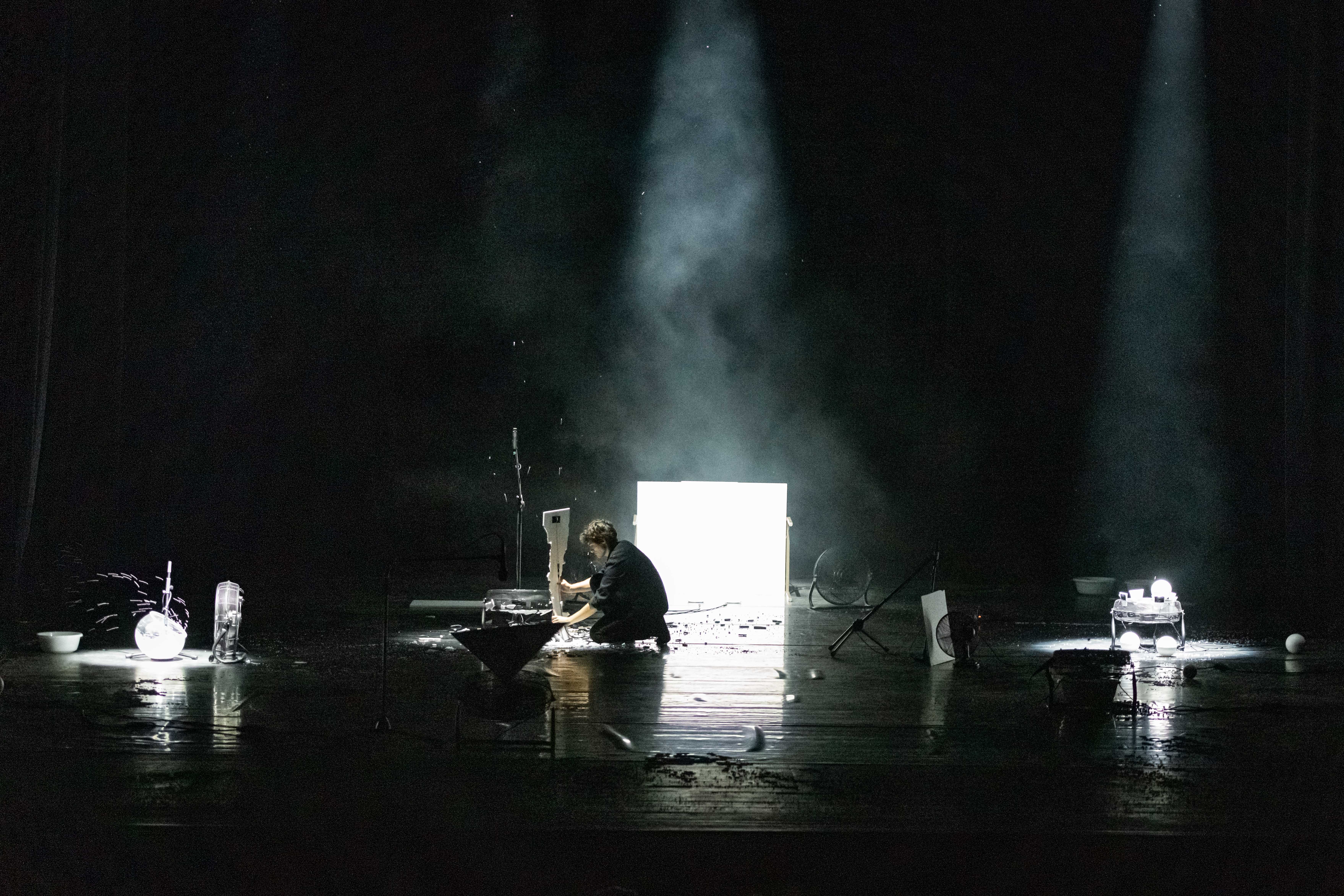 Le premier rôle de cette performance est tenu par des formes en polystyrène. Du Sagex, si vous préférez. Des formes manipulées par un opérateur, cassées, broyées, en une sorte de ballet étrange où l’esprit de jeu et de découverte s’empare d’un matériau pour l’offrir en support à notre imaginaire.