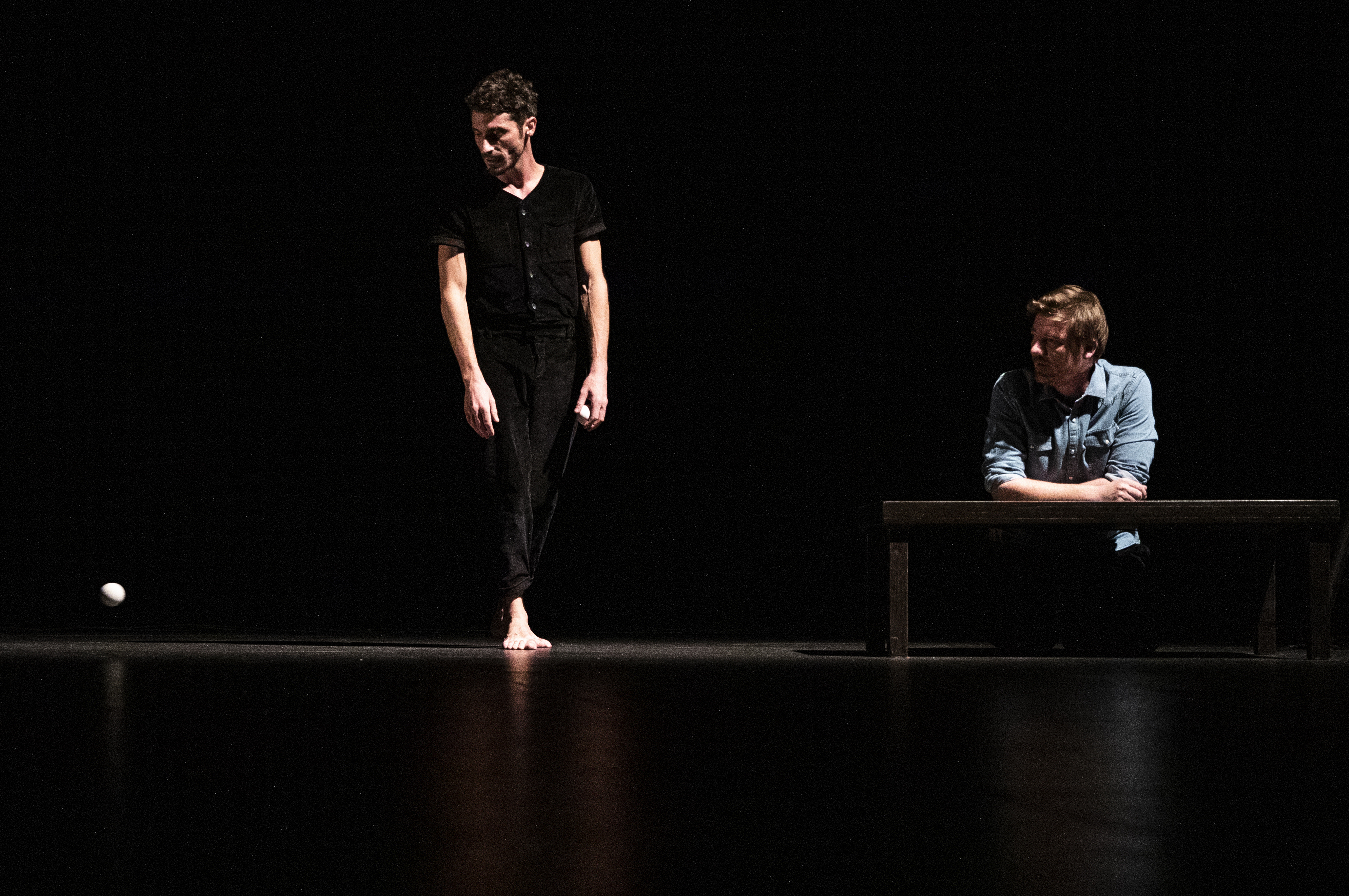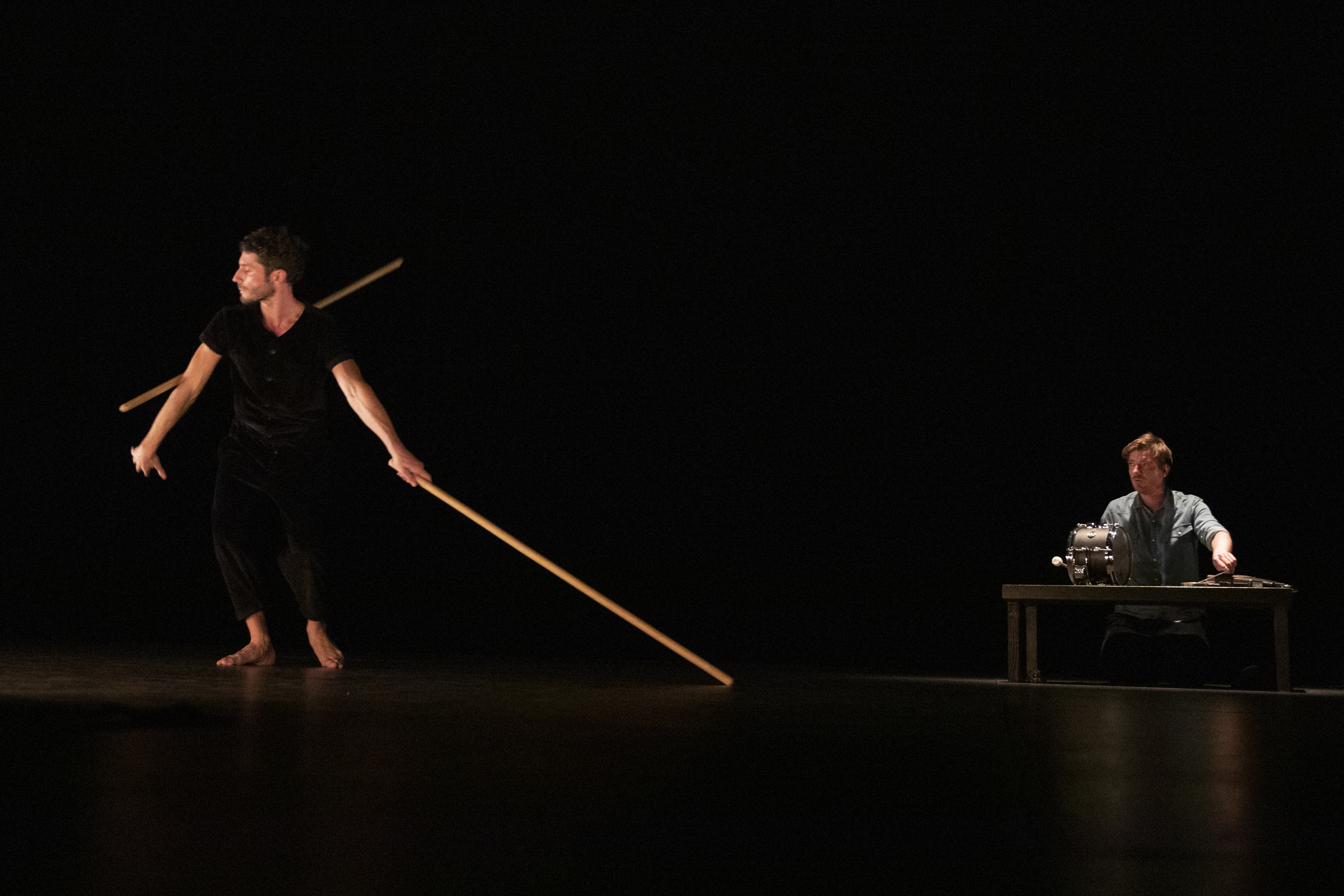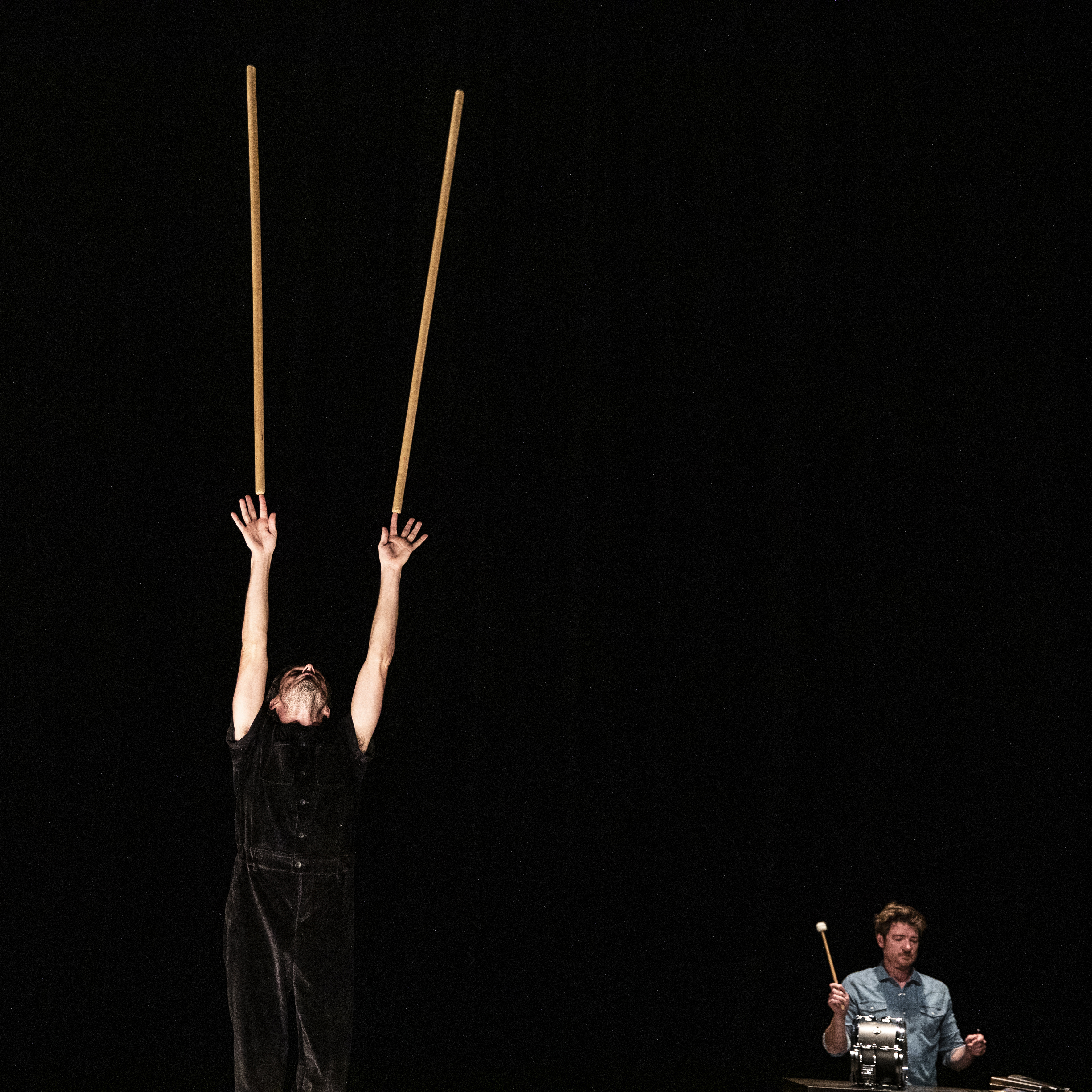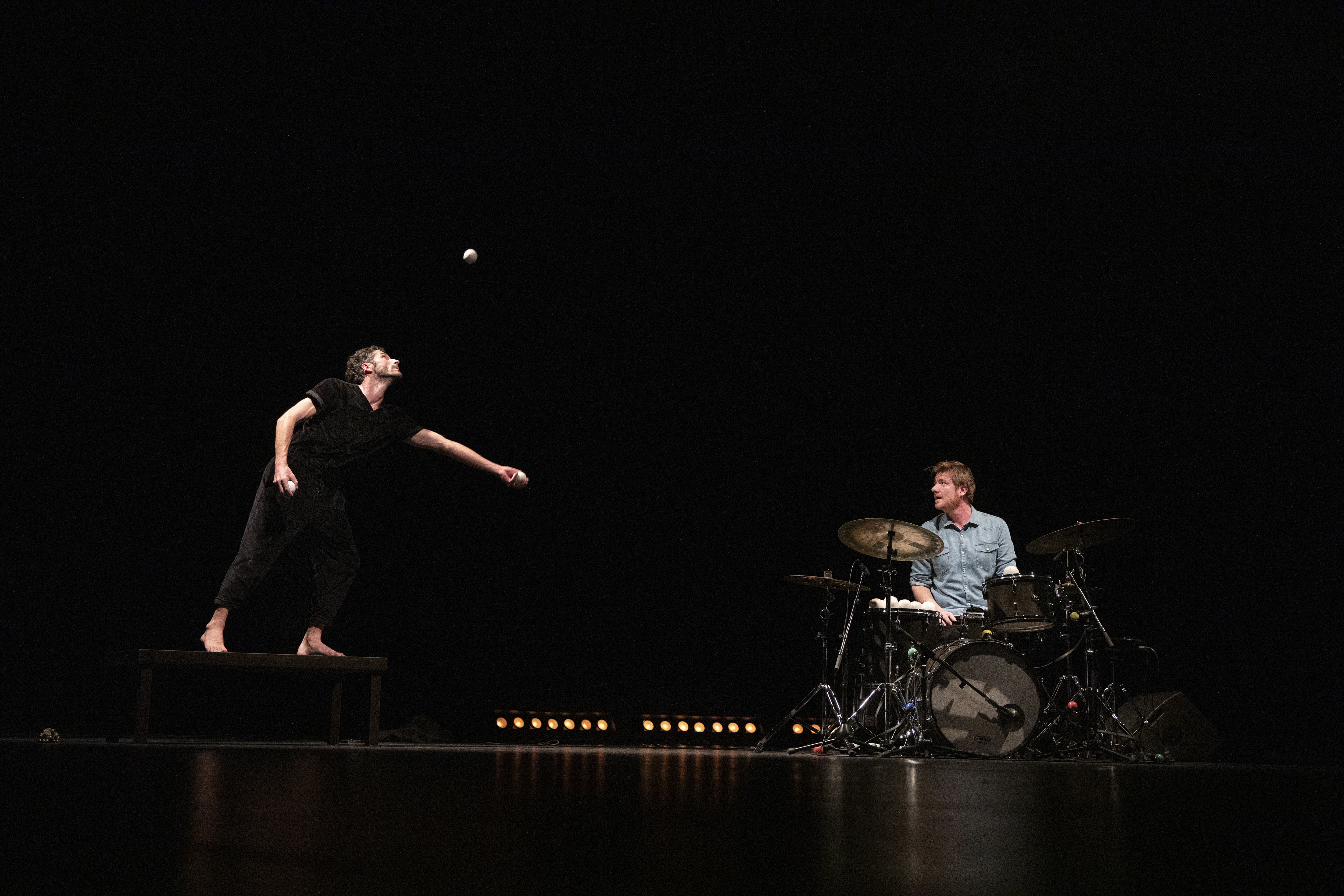 S’assurer de ses propres murmures contient une promesse d’intimité, d’écoute réciproque. Le public est accueilli comme s’il entrait dans le salon des artistes, un jongleur et un batteur. Place dès lors à un spectacle à la croisée d’une représentation de cirque et d’un concert, véritable rituel d’amitié et ode au jeu.