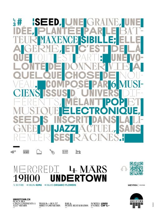 Elle a germé et c’est de là que tout est parti. Une volonté de donner vie à quelque chose de nouveau. Initié par le batteur Maxence Sibille, SEED regroupe 6 musiciens à forte personnalité musicale, issus d´univers différents qui n´avaient jusque-là jamais été réunis. Mêlant pop et musique électronique, SEED s´inscrit dans la lignée du Jazz dit actuel sans pour autant renier l´héritage de ses « pairs ».